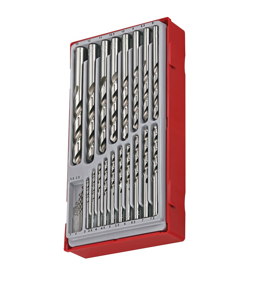 Conjunto de 28 peças de brocas com ângulo espiral de 28° e ponto de divisão de 118° para uso em aço e ferro fundido. DIN 338. O conjunto é fornecido em uma bandeja exclusiva Teng Tools TC e pode ser usado tanto individualmente quanto como parte do sistema de controle TC da Teng Tools. A bandeja possui uma tampa removível com trava de clipe articulado e juntas de cauda de andorinha que permitem travar diferentes bandejas TC juntas e usá-las como bandejas em caixas de ferramentas e gabinetes com rodas da Teng Tools. Todas as ferramentas no conjunto têm seu próprio lugar individual, facilitando a identificação de ferramentas perdidas. (265x142x50mm, 0.6 quilos). Conteúdo: Haste do mesmo diâmetro das brocas. Diâmetros das brocas em mm: 1.0, 1.5, 2.0, 2.5, 3.0, 3.5, 4.0, 4.5, 5.0, 5.5, 6.0, 6.5, 7.0, 7.5, 8.0, 8.5, 9.0, 10.0, 11.0, 12.0, 13.0. Desempenho: Totalmente retificado.