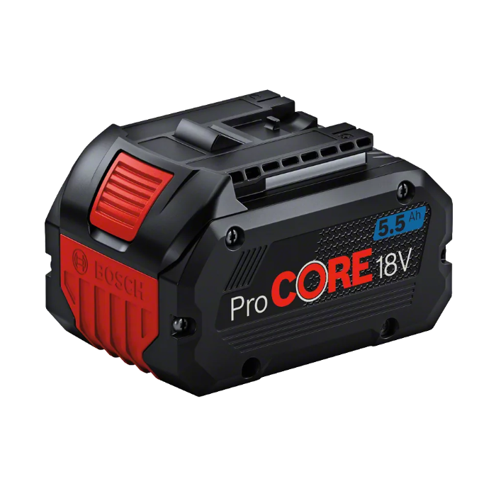 A ProCORE18V 5.5Ah Professional é uma bateria de elevado desempenho que fornece o equivalente de até 2000 Watts de potência de alimentação com fio. A sua nova geração de tecnologia de células, combinada com a gestão inteligente de bateria, fornece 87% mais potência do que as baterias convencionais. A bateria também utiliza a tecnologia COOLPACK 2.0 para melhorar a dissipação de calor do interior para o exterior da bateria. Como o calor pode danificar as células, esta tecnologia COOLPACK 2.0 fornece uma impressionante vida útil 135% maior do que as baterias standard, permitindo trabalhar durante períodos maiores. Compatível com todas as ferramentas e carregadores do sistema Professional 18V System da Bosch e da AMPShare Alliance.