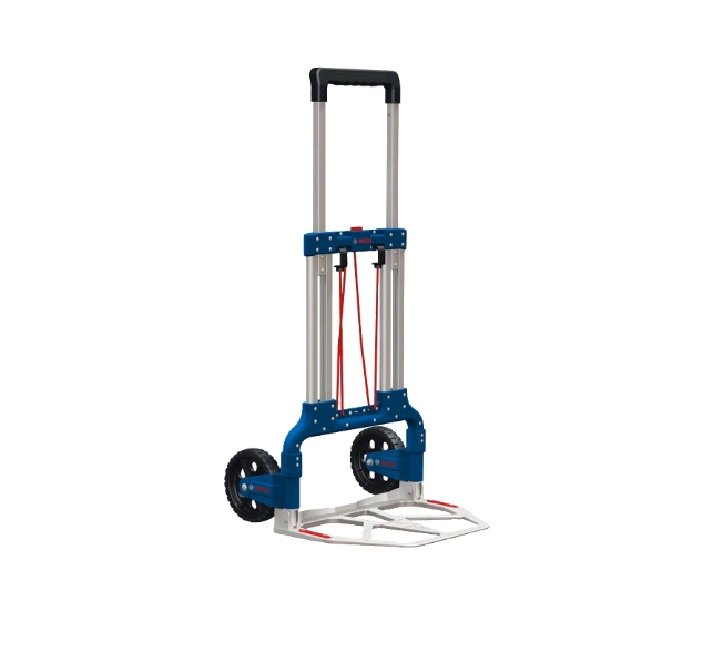 O Aluminium Caddy fornece transporte prático em linha com o Bosch Mobility System. É feito de alumínio e vem com uma pega e rodas dobráveis para armazenamento leve e economia de espaço. A placa base compatível e a fita elástica fixam com segurança os elementos L-BOXX empilhados para transporte seguro. Com uma capacidade de carga de 125 kg no chão e 60 kg em escadas, este carrinho é estável e robusto. É a solução de transporte ideal para elementos L-BOXX e L-Cases.