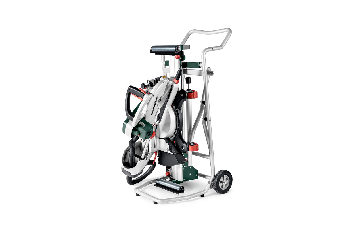 • Cavalete para serras de corte transversal particularmente robusto, com função de trolley para utilização móvel, mesmo com a serra montada