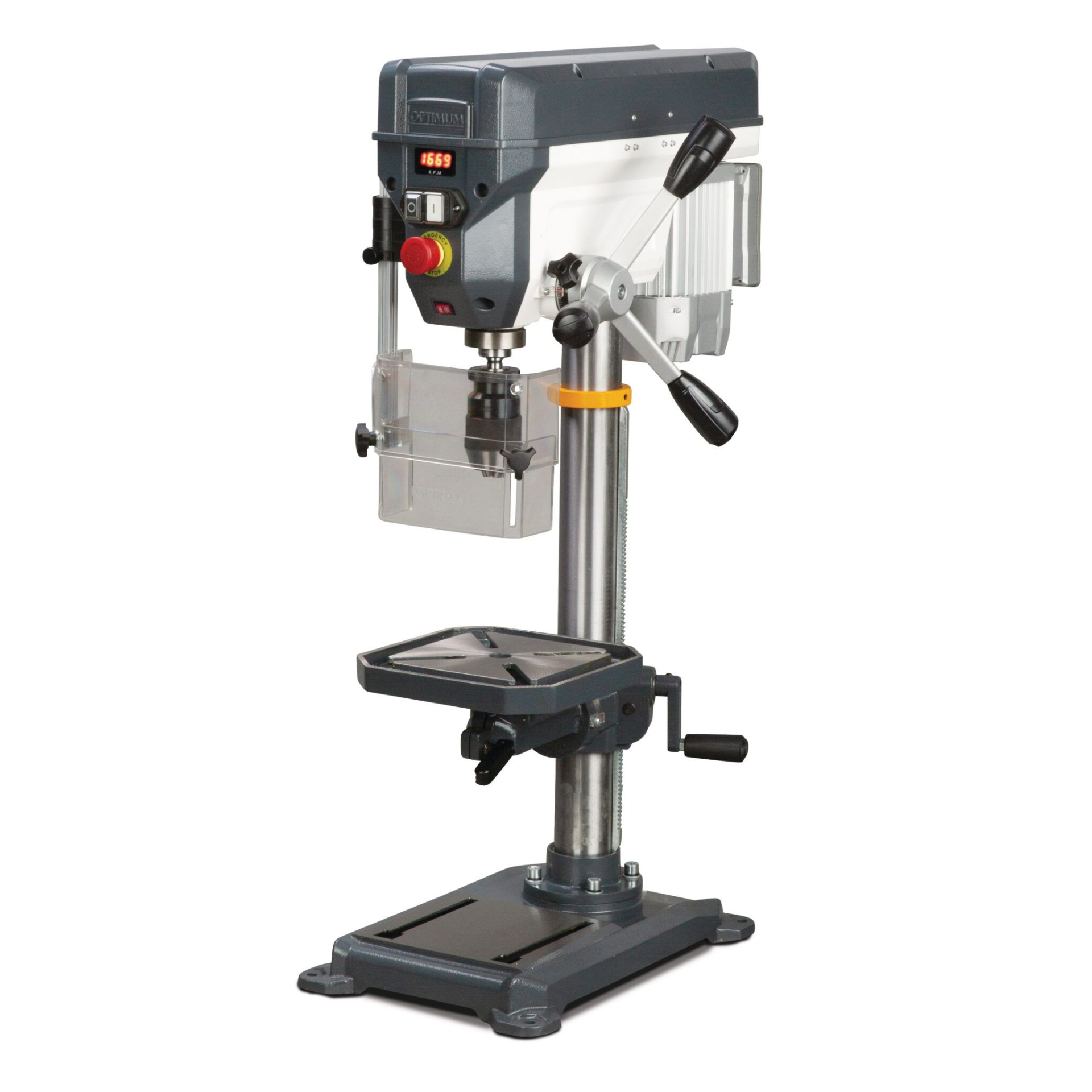 Engenho de furar de bancada com acionamento por correia trapezoidal e velocidade infinitamente ajustável mecanicamente