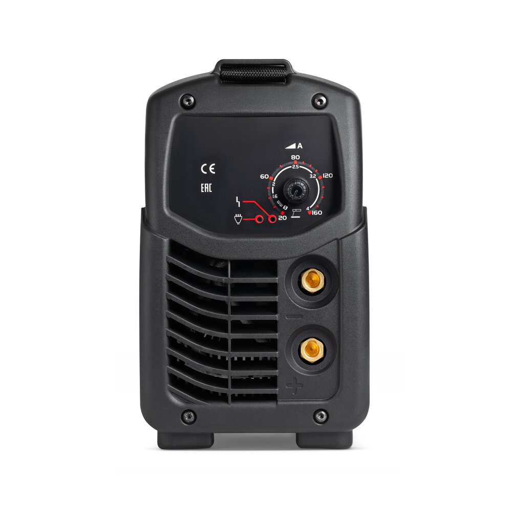 Aparelho de soldar com inversor de elétrodo MMA e TIG em corrente contínua (CC), 160A. Fornecido com acessórios para a soldadura com elétrodo. Elétrodos utilizáveis: rútilos, básicos, inox, ferro fundido, etc. até 4 mm. Dispositivos avançados de controlo do arco: arc force, hot start, anti-stick. Proteção termostática, sobretensão, subtensão, sobreintensidade. Compatível para utilização com motogerador (230V+/- 15%). Elevada estabilidade da corrente de soldadura às alterações da tensão de alimentação. Leve e compacto. Fácil de transportar. Consumos reduzidos graças à tecnologia inverter.