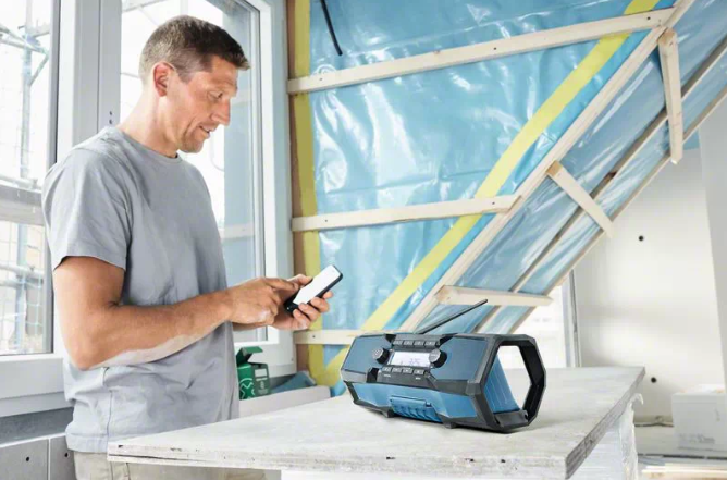• Flexível e prático: o rádio portátil que emite música rock em todos os estaleiros de obras